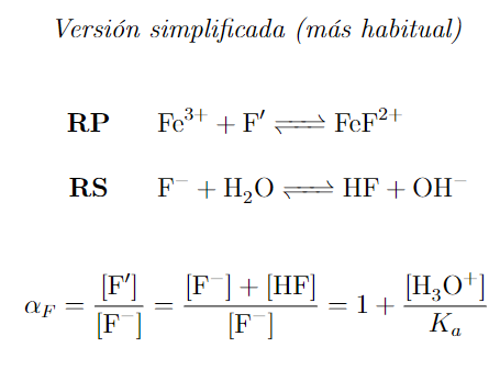 () Sólo cuando las concentraciones de FeCl3 y NaF son iguales resulta relativamente fácil (quedando [Fe3+] en función del pH). Para el caso general, la expresión se complica bastante (imagen de la derecha). Disculpad por si hay errores, he hecho el cálculo rápido.